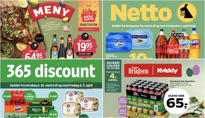 Hos Coop365 kan du få forskellige pakker med drikkevarer til kun 59 kr. pr. pakke. Begrænsning på 6 pakker pr. kunde. Tilbuddet gælder fra torsdag d. 26. marts til fredag d. 3. april.